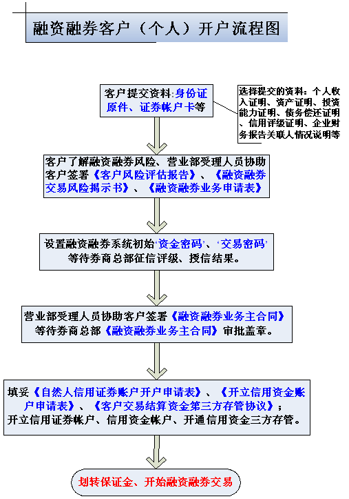 1、(《融资融券业务主合同》经总部审批通过后)根据个人基本资料,填妥《自然人信用证券账户开户申请表》后,客户签字确认,由营业部协助开立上海、深圳信用证券账户;上海信用证券账户下一个交易日由营业部申报指定交易;